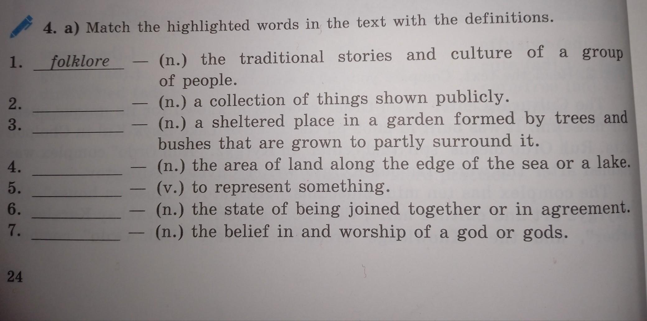 1.folklore - (n.) the traditional stories and culture of a group of people.