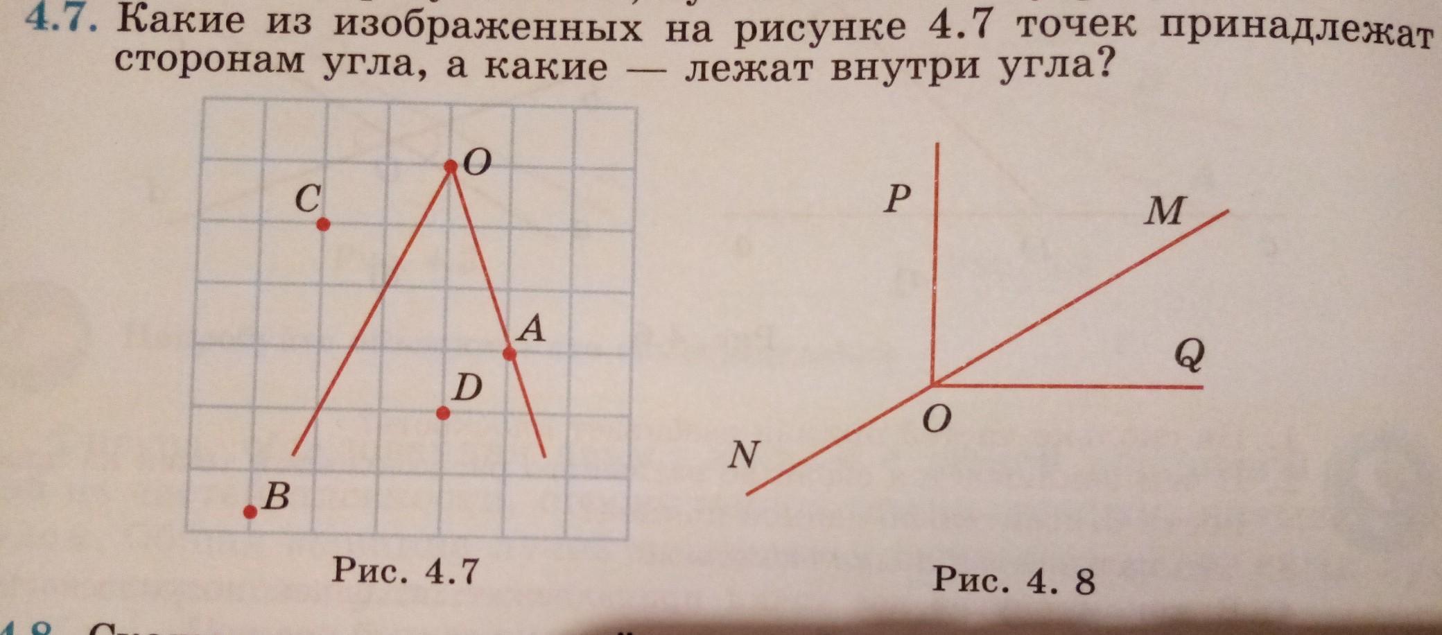лежал внутри угла ВОС, луч 4.7. Какие из изображенных на рисунке 4.7 точек принадлежат лежат внутри угла? сторонам угла, а какие P Ак A D 0 N C B - Рис. 4.7 Рис. 4. 8 M