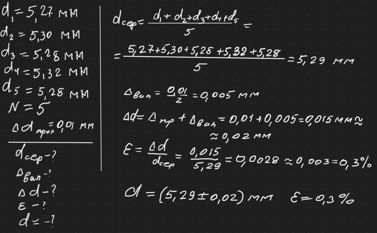 Вимірювання діаметра d металевої кульки проводили N = 5 разів за допомогою мікрометра, абсолютна похибка якого дорівнює Δdприл = 0.01 мм. Було одержано наступні результати: = 5.27 мм, = 5.30 мм, = 5.28 мм, = 5.32 мм, = 5.28 мм. 1) Обчислити: середнє значення діаметра кульки сер ; випадкову похибку вимірювання ∆вип , абсолютну та відносну похибки вимірювання . 2) Округліть одержані результати й запишіть результат вимірювання іст.