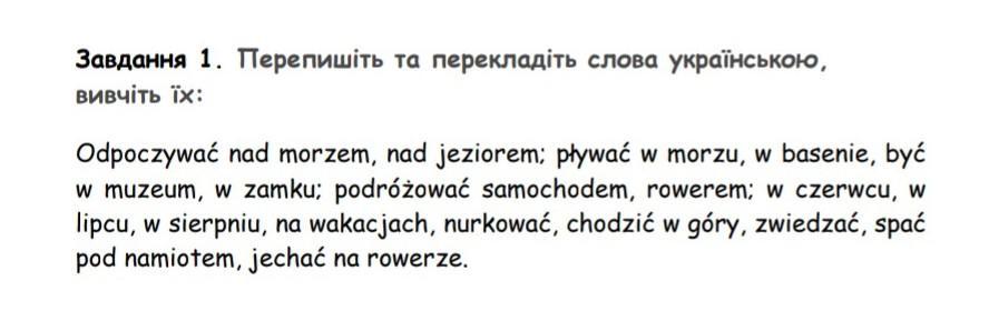 Відпочинок біля моря, біля озера: купатися в морі, в басейні, в музеї, в замку: подорож на машині, велосипеді; у червні, липні, серпні, у відпустці, дайвінг, походи, екскурсії, ночівля в наметі, велопрогулянки.