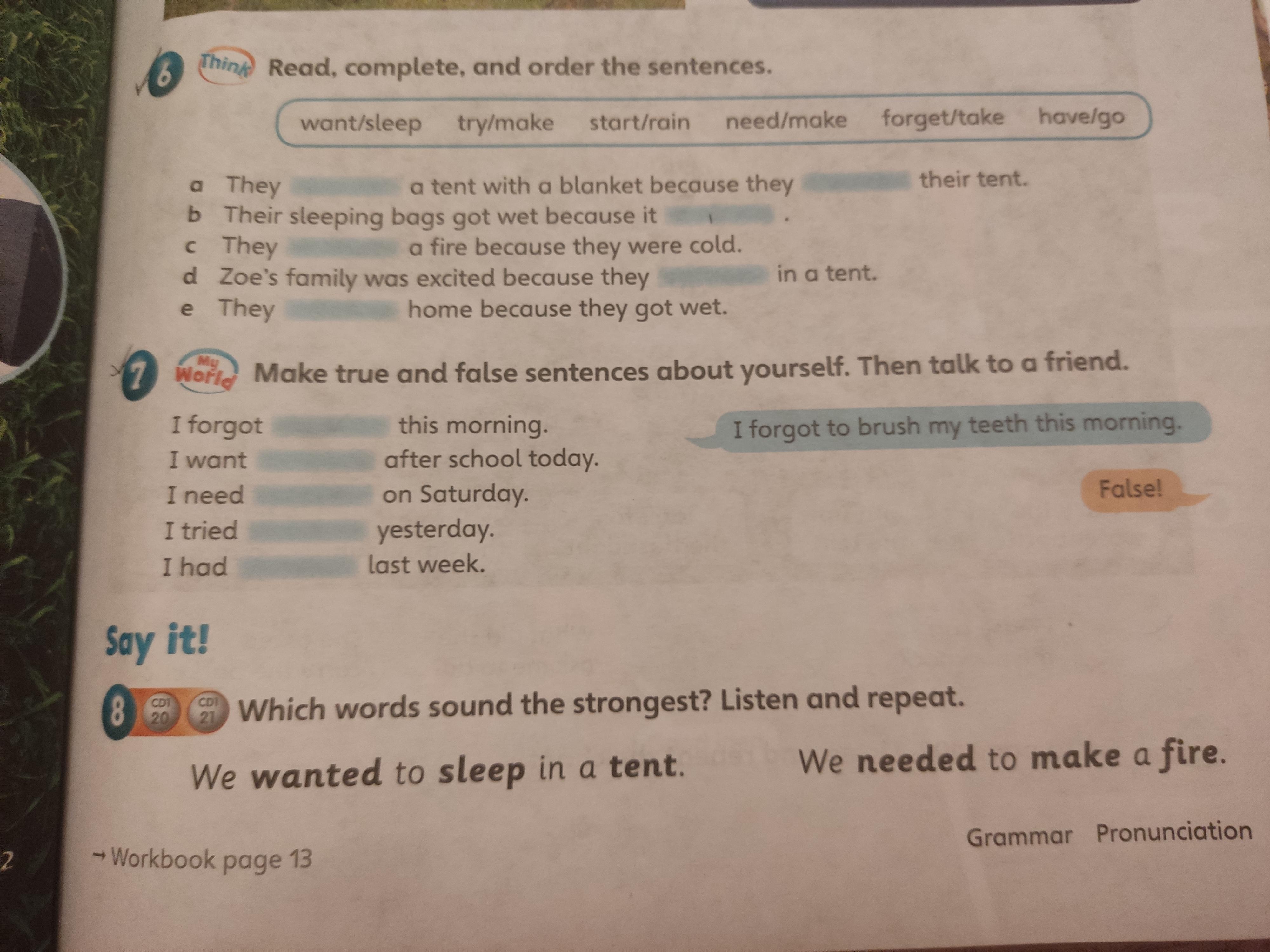 Make true and falce sentences about yourself. Then talk to a friend. I forgot___ this morning. I went____ after school today. I need___ on Saturday. I tried___ yesterday. I had___ last week