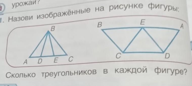 1. Назови изображённые на рисунке фигуры: в в ADEC C E A D Сколько треугольников в каждой фигуре? 5