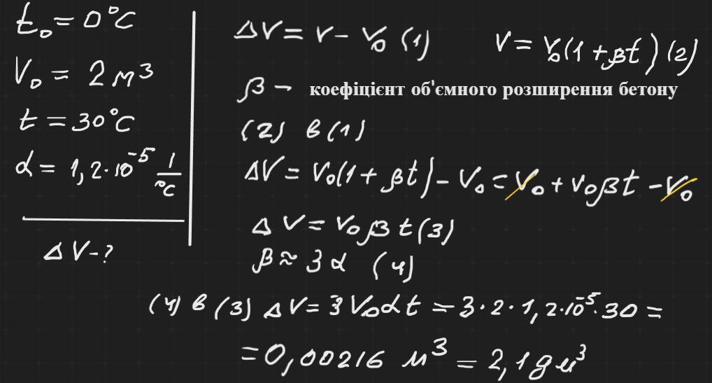 об'єм бетонної плити за температури 0°C становить 2 м³ На скільки збільшиться її об'єм при підвищенні температури до 30°C? Коефіцієнт лінійного розширення бетону a=1,2×10^-5 K^-1