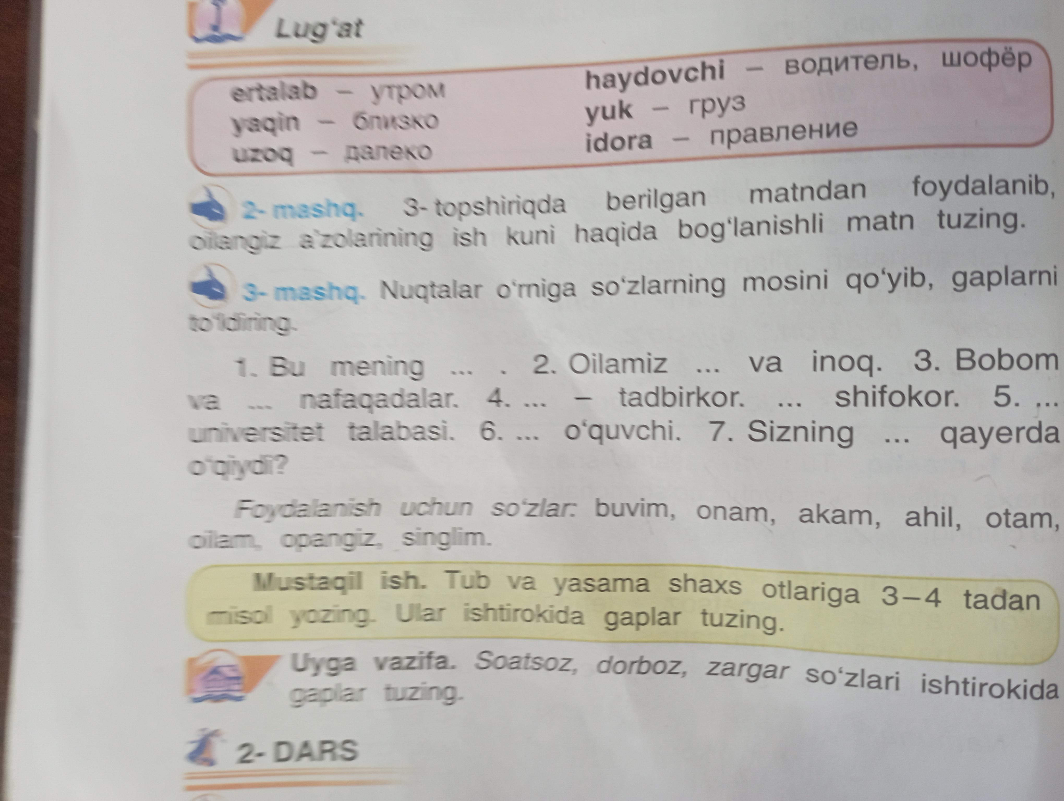1. Bu mening oilam. 2. Oilamiz ahil va inoq. 3. Bobom va buvim nafaqadalar. 4.Otam- tadbirkor. Onam shifokor. 5. Akam universitet talabasi. 6. Singlim o'quvchi. 7. Sizning opangiz qayerda o'qiydi?