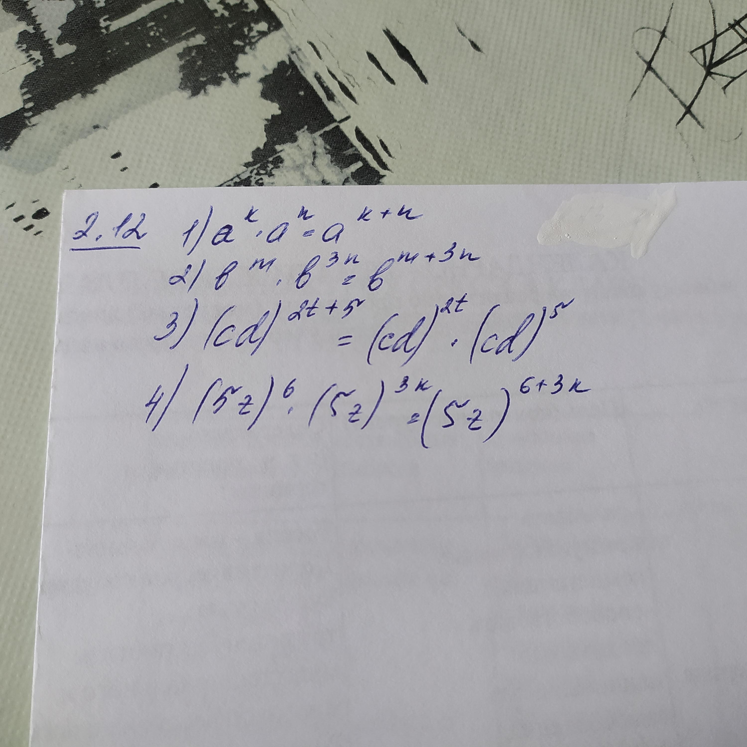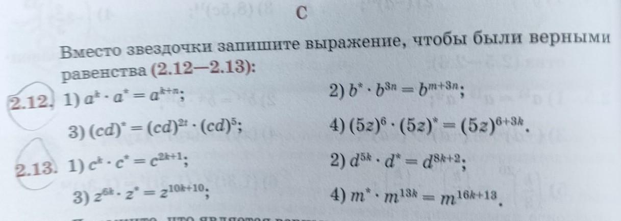 Вместо звездочки запишите выражение, чтобы были верными равенства (2.12-2.13): 2.12, 1) ak . a* = ak+n; = 3) (cd)* = (cd)2t . (cd)5; = 2.13. 1) ck . c* = (2k+1; = 1/ 3) 26k. 2* = 210k+10. с TT 2) b* . b3n = bm+3n: 4) (52)6 (52)* = (52)6+3k. 2) dək • d* = q8k+2; - 4) m* · m13k 16k+13 m² =