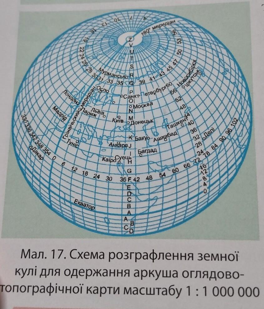 3. Користуючись мал. 17 на с. 32, з'ясуйте, в яких рядах і колонах (зонах) згіл- но з міжнародною схемою розграфлення земної кулі розташована територія України.