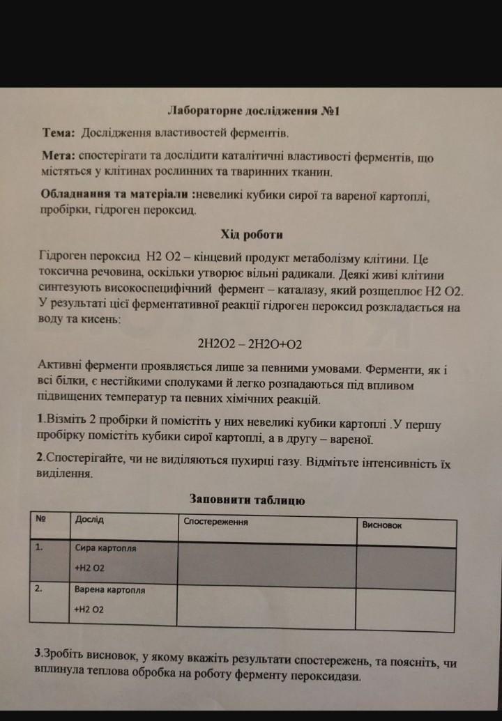 Висновок: Фермент каталаза роспадається при дії великих температур, тому реакція розщеплення не відбувається