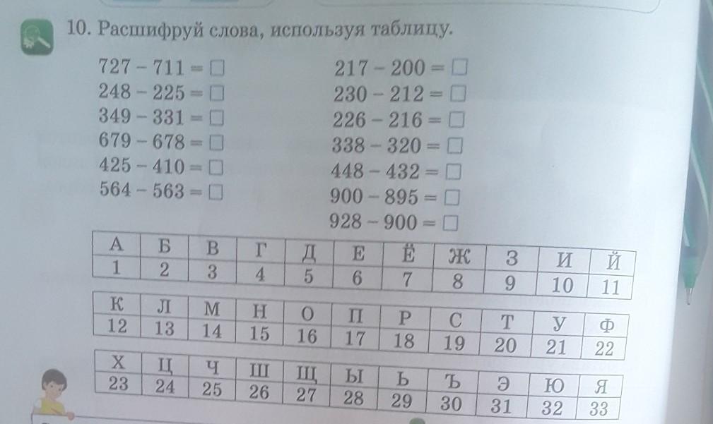 10. Расшифруй слова, используя таблицу. 727-711-O 217-200-0 248-225-0 230-212- 349-331-0 226-216-0 679-678-0 338-3200 425-410-0 564-563-0 A 1 38 K 12 X 23 Б 2 B r 4 B8 3 Л M Н 0 13 14 15 16 Ц Ч III 24 25 26 Составь вопросы и задания по теме урока. 448-432 900-895 928-900 Д E 5 Ë 6 7 27 II 7 17 Ы 28 Поделись P 18 Ж 8 3 9 И 10 С T у 19 20 21 Ь Ъ Э Ю 29 30 31 32 придумай Й 11 22 Я 33