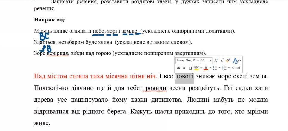 Тиха, місячна літня (однорідні означення); море,скелі земля (однорідні додатки); дівчино (поширене звертання); гаї, садки ,хати, дерева(однорідні підмети); ,мабуть,(вставне слово); Кажать, ...(вставне слово)