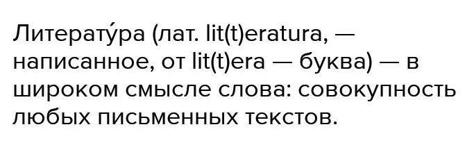 Объяснение:Происходит от лат. litteratura (literatura) «написанное, рукопись, сочинение; азбука; образованность», далее из littera (litera) «буква»