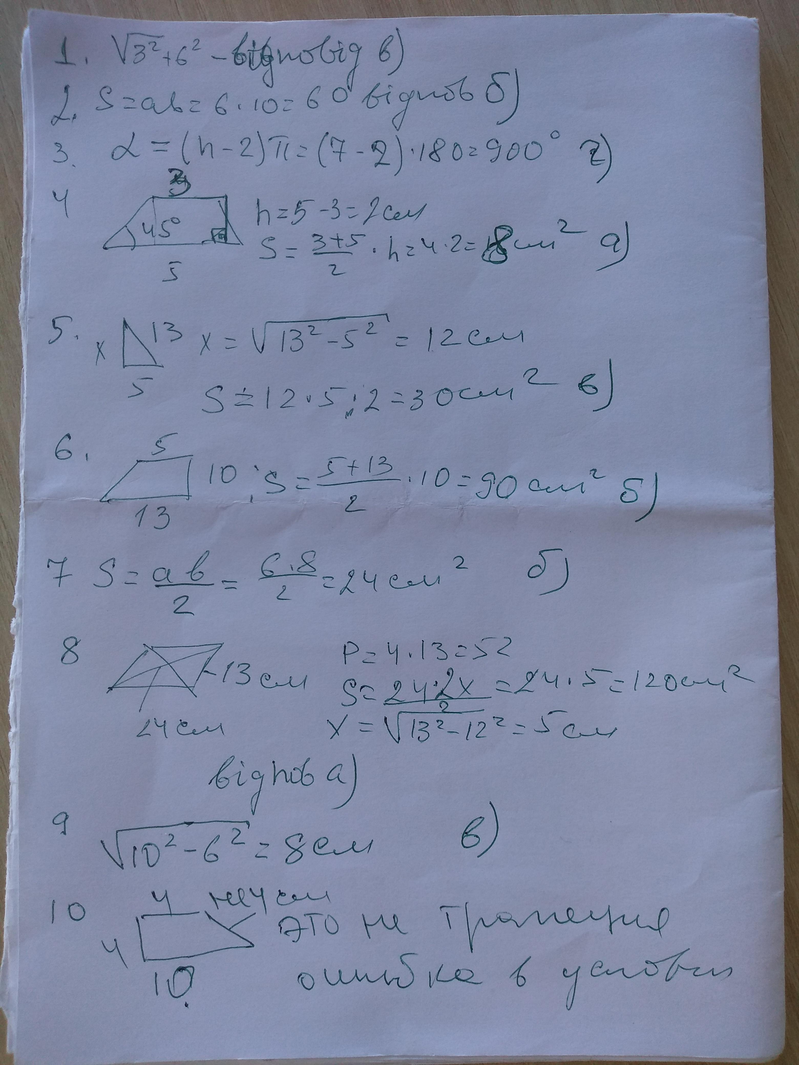 1. Знайдіть гіпотенузу прямокутного трикутника, катети якого дорівнюють 3 см і 6 см варіанти відповідей: а) 2²+4²; б) √6-²3²; в) √6²+3²; г) √2²+4². 2. Знайдіть площу прямокутника, ширина й довжина якого дорівнюють 6 см і 10 см варіанти відповідей: а) 50 см²; б) 60 см²; в) 40 см²; г) 30 см². 3. Знайдіть суму кутів опуклого семикутника варіанти відповідей: а) 360°; б) 180°; в) 1080°; г) 900°. 4. Один із кутів прямокутної трапеції дорівнює 45°. Обчисліть площу даної трапеції, якщо її основи дорівнюють 3 см і 5 см варіанти відповідей: а) 8 см²; б) 24 см²; в) 20 см²; г) 6 см². 5. Знайдіть площу прямокутного трикутника, якщо гіпотенуза дорівнює 13 см, а один із його катетів – 5 см. варіанти відповідей: а) 2 см²; б) 60 см²; в) 30 см²; г) 4 см². 6. У прямокутній трапеції більша бічна сторона дорівнює 10 см. Знайдіть площу трапеції, якщо її основи дорівнюють 5 см і 13 см варіанти відповідей: а) 64 см²; б) 90 см²; в) 128 см²; г) 54 см². 7. Знайти площу ромба, якщо діагоналі дорівнюють 6 і 8 см. варіанти відповідей: а) 48 см²; б) 24 см²; в) 42 см²; г) 20 см². 8. Знайти периметр та площу ромба, якщо сторона дорівнює 13 см, а одна з діагоналей - 24 см. варіанти відповідей: а) 52 см, 120 см²; б) 52 см, 240 см²; в) 52 см, 100 см²; г) 52 см, 144 см². 9. До прямої опущено перпендикуляр довжиною 6 см, а довжина похилої – 10 см. Знайдіть проекцію похилої на пряму. варіанти відповідей: а) 5 см; б) 6 см; в) 8 см; г) 9 см. 10. Сторони трапеції дорівнюють 4см, 4см, 4см, 10см. Знайдіть середню лінію трапеції. варіанти відповідей: а) 8см; б) 10см; в) 7 см; г)14см.
