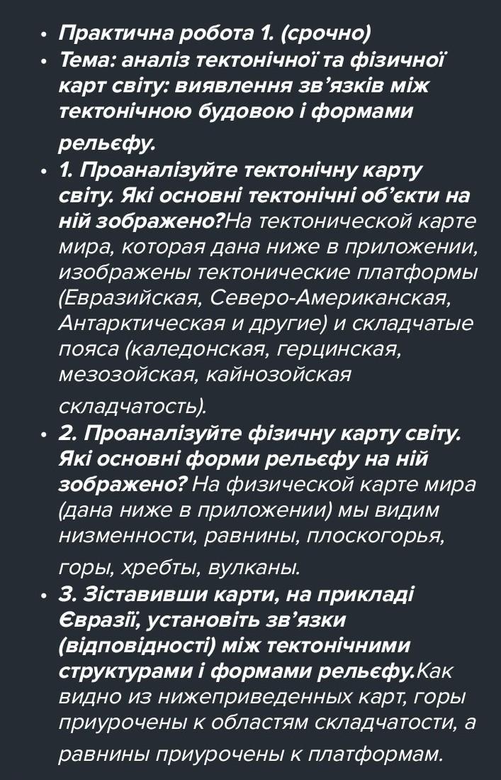 Практична робота 1 Аналіз тектонічної та фізичної карт світу: виявлення зв'язків між тектоніч- ною будовою і формами рельєфу.