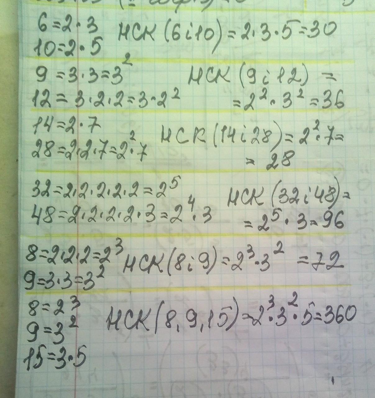 Знайдіть найменше спільне кратне чисел: 1) 6 i 10; 2) 9 i 12; 3) 14 i 28; 5) 32 i 48; 4) 8 i 9; 6) 8, 9 i 15.
