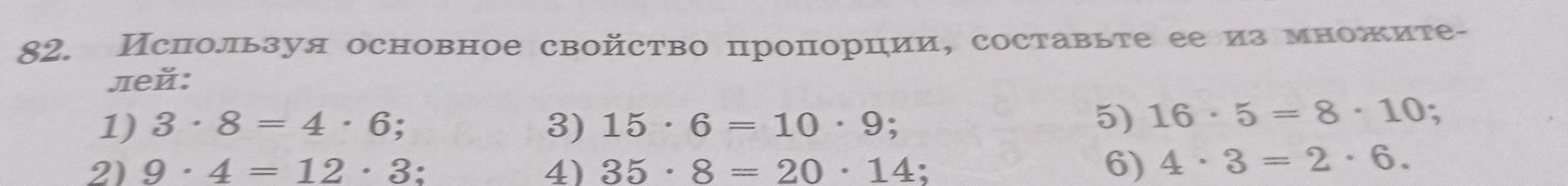 82. Используя основное свойство пропорции, составьте ее из множите- лей: 1) 3-84-6; 2) 9 4 12 - 3; - 3) 15 6 4) 35 8 • - 10 9; 2014; б • 5) 16 5 8 - 10; 6) 432-6.