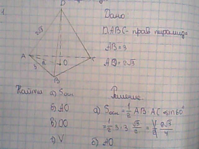 Пирамида ДАВС, в основании равносторонний треугольник, АВ=ВС=АС=3, проводим высоту АН на ВС, АН=АВ*корень3/2=3*корень3/2, АО=2/3АН (если провести все медианы то ини в точке пересечения делятся в отношеннии 2/ начиная от вершины), АО=(3*корень3/2)*(2/3)=корень3, треугольник АДО прямоугольный, ДО=корень(АД в квадрате-АО в квадрате)=корень(12-3)=3-высота пирамиды, площадь АВС=АВ в квадрате*корень3/4=9*корень3/4, объем=1/3*площадьАВС*высота=1/3*(9*корень3/4)*3=9*корень3/4