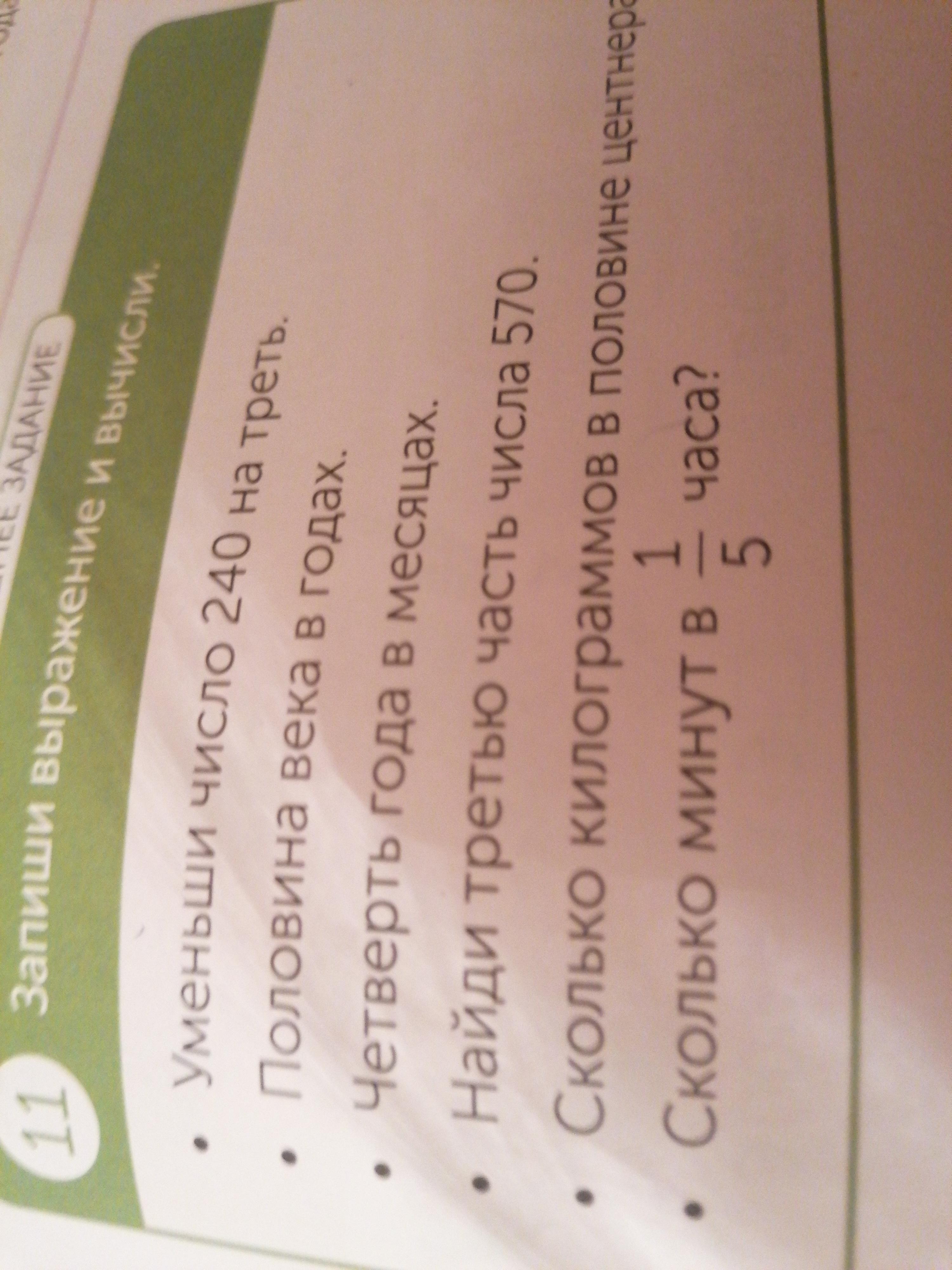 11 Запиши выражение и вычисли. • Уменьши число 240 на треть. о Половина века в годах. Четверть года в месяцах. Найди третью часть числа 570. • Сколько килограммов в половине центнера? 1 часа? 5 • Сколько минут