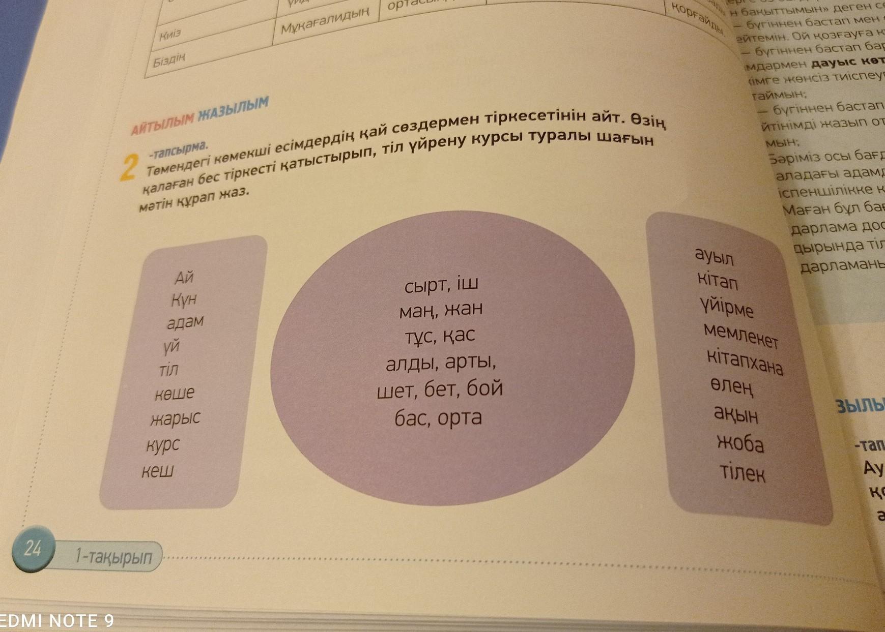 АЙТЫЛЫМ ЖАЗЫЛЫМ -тапсырма. 2 Темендегi кемекшi есiмдердiң кай сездермен тiркесетінін айт. Өзің калаған бес тiркестi катыстырып, тiл уйрену курсы туралы шағын мәтін құрап жаз.