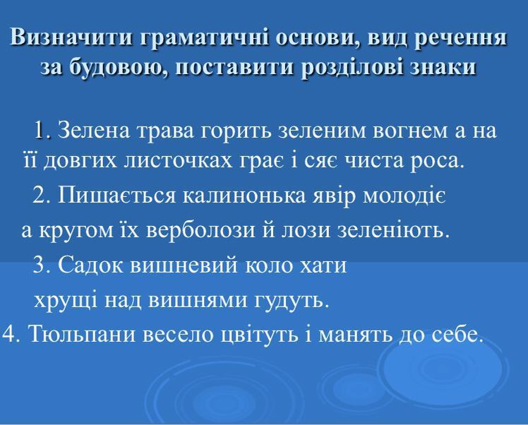 1.Зелена трава(підмет) горить(присудок) зеленим вогнем, а на її довгих листочках грає і сяє(однорідні присудки) чиста роса(підмет)- речення за будовою складне 2 ГО