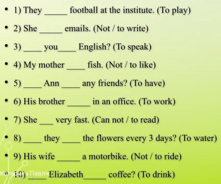 ВПРАВА 1. ВИКОРИСТОВУЙТЕ СЛОВА В ДУЖКАХ ДЛЯ УТВОРЕННЯ РЕЧЕНЬ В PRESENT SIMPLE. ЗВЕРНІТЬ УВАГУ, В ЯКІЙ ФОРМІ МАЄ СТОЯТИ РЕЧЕННЯ (СТВЕРДЖУВАЛЬНЕ. ПИТАЛЬНЕ АБО ЗАПЕРЕЧНЕ).