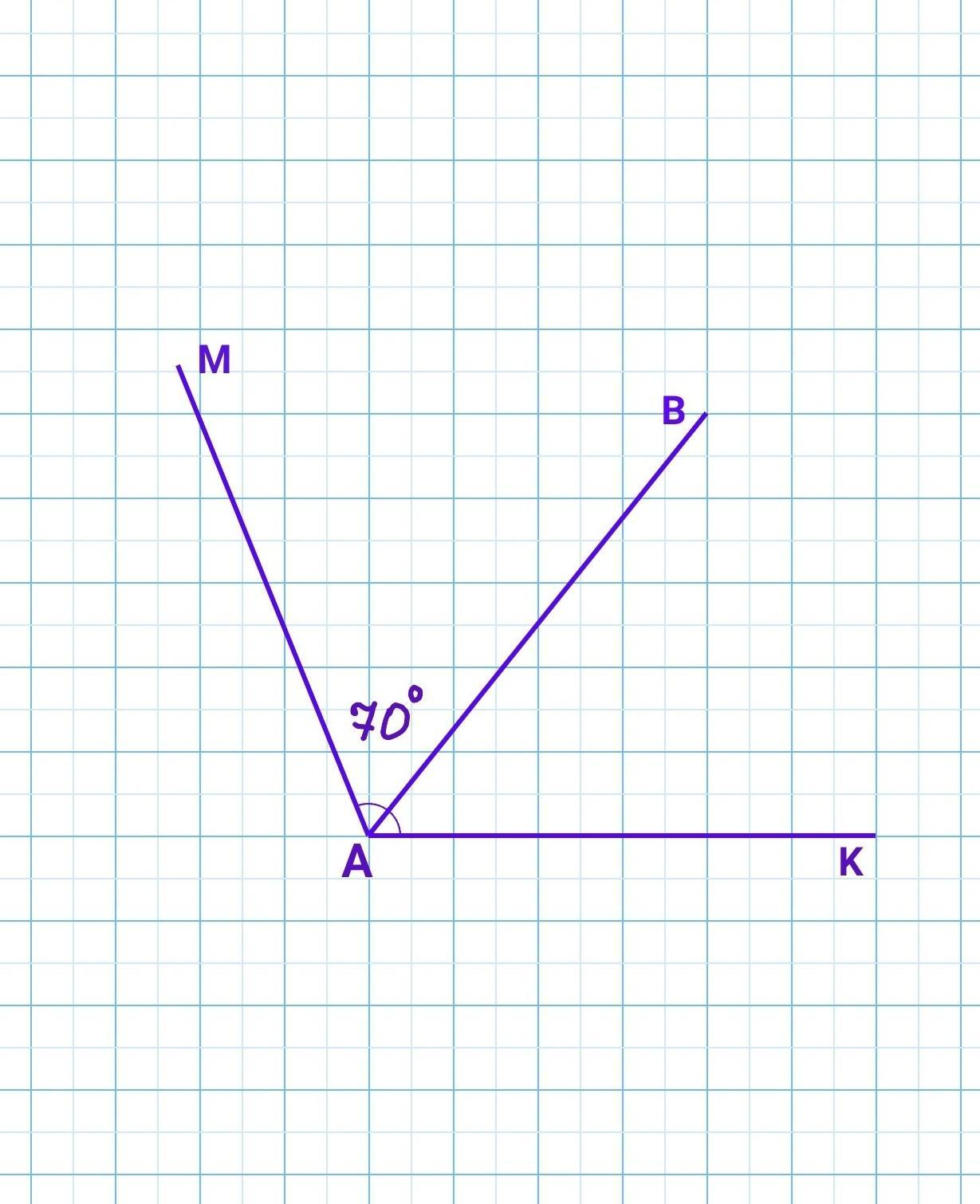 Промінь AB ділить кут М АК на два кути. Знайдіть градусну міру кута МАК, якщо кут МАВ = 70°, a кут ВАК складає 0,6 від кута МАВ.