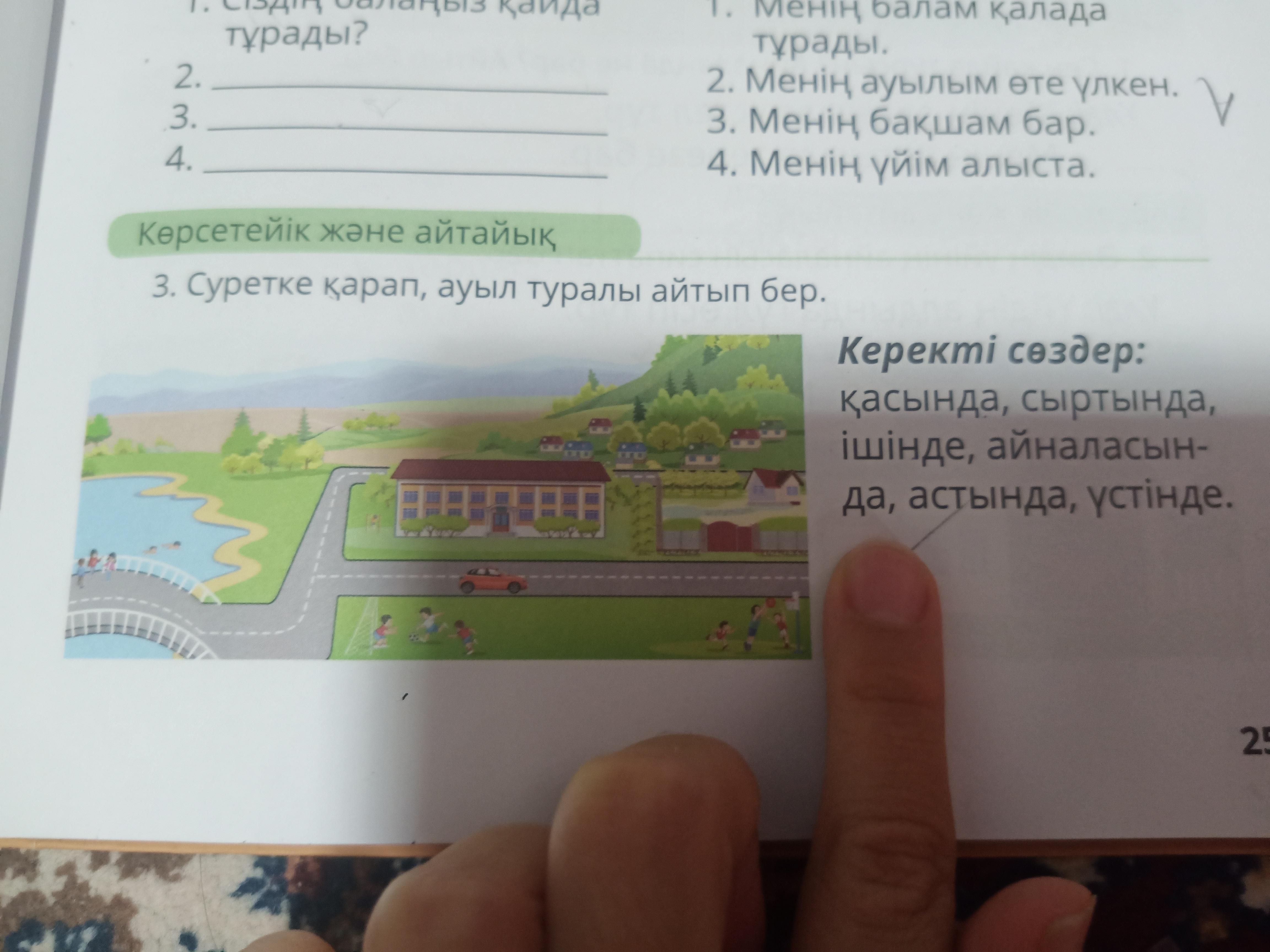 Відповідь: Ауылдың ішінде өзінің керемет тұрғындары бар. Ауыл қасында өзен бар. Ауыл сыртында қала бар. Ал үсттінде таулар бар. Уыл мектебінің айналасында жол бар.