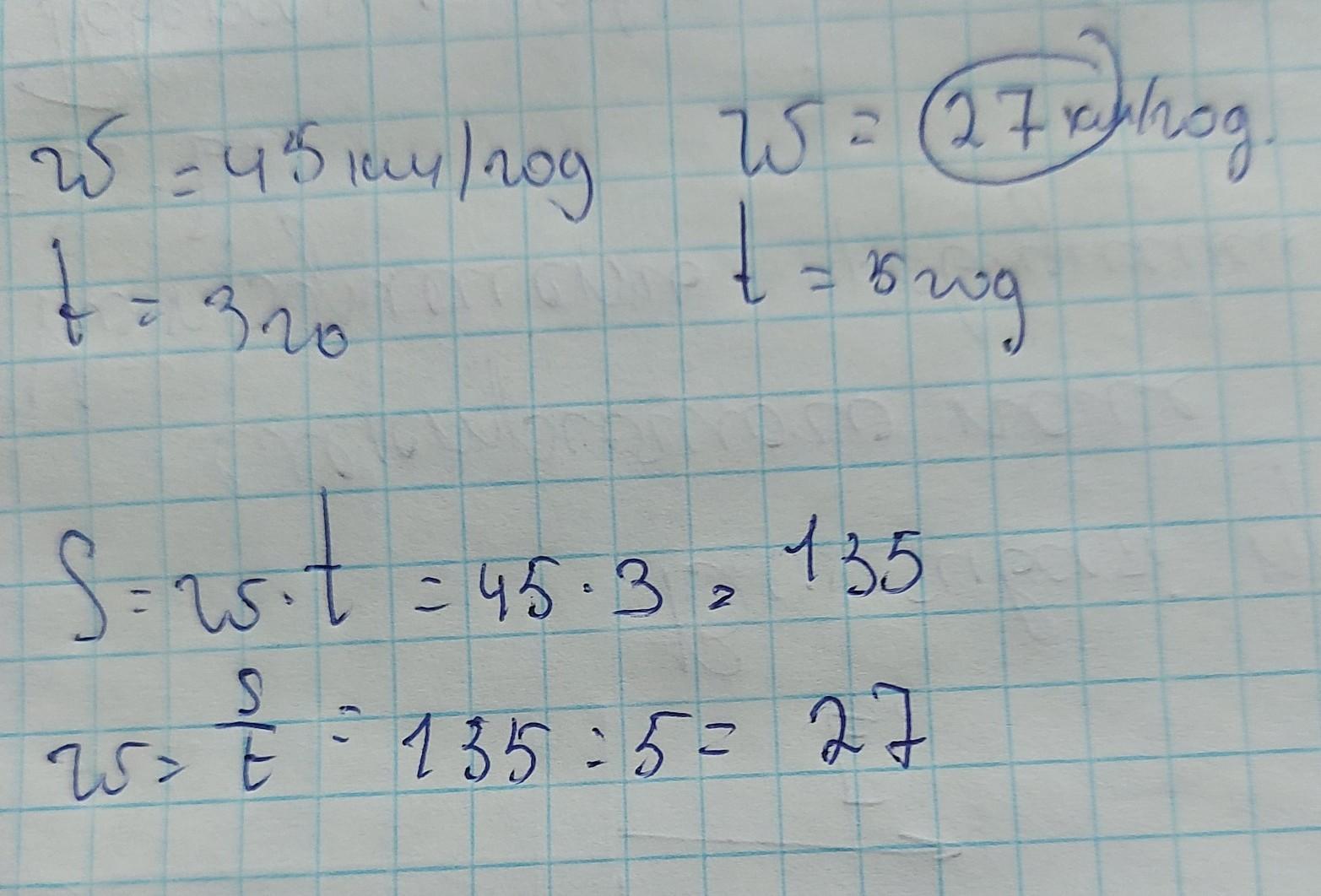 Швидкість першого велосипедиста 45км/год. Він був у дорозі 3 год. З якою швидкістю подолав цю відстань другий велосипедист, якщо він їхав 5 годин?