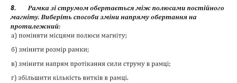 Рамка зі струмом обертається між полюсами постійного магніту. Виберіть способи зміни напряму обертання на протилежний: