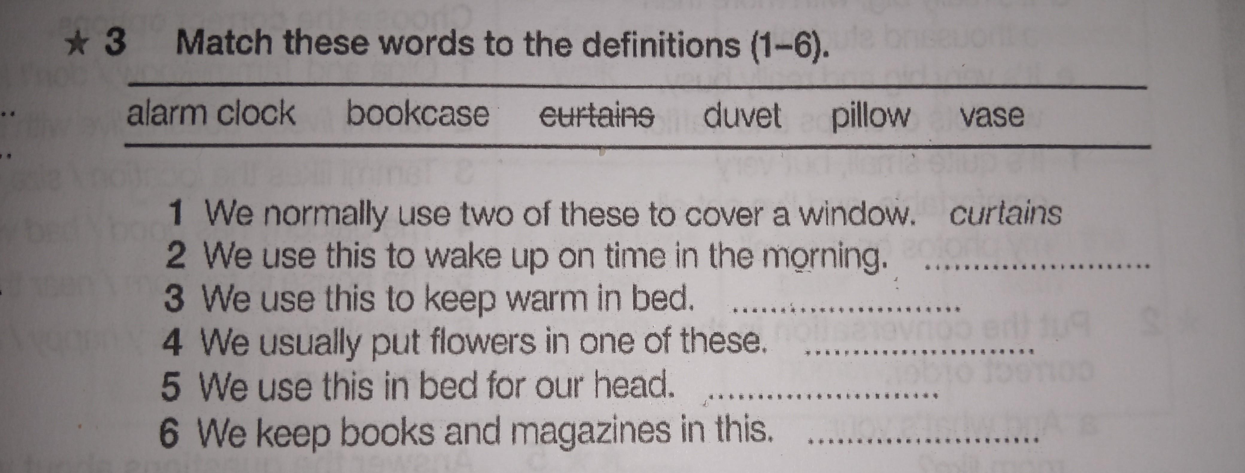 2. Alarm clock 3 Duvet 4 vase 5 pillow 6