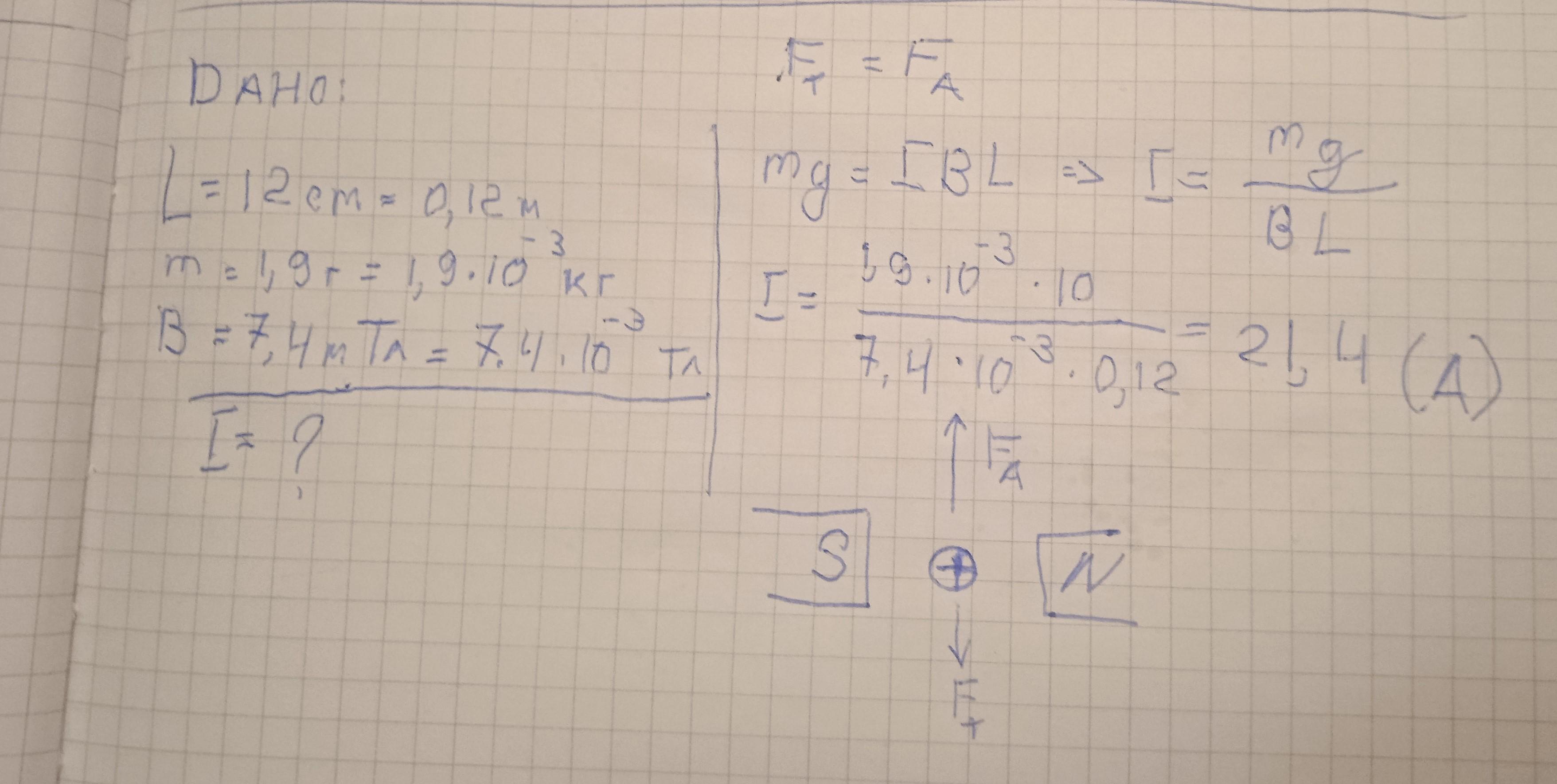 дам 69 баллов сверху. Сила струму в провіднику довжиною L і масою m дорівнює I. Якщо помістити провідник у магнітне поле напруженістю B, сила тяжіння буде зрівноважена силою Ампера. Знайдіть силу струму у провіднику, якщо L = 12 см, m = 1,9 г, а B = 7,4 мТл. Побудуйте рисунок до задачі, укажіть на ньому напрямок сили струму та напрямок вектора індукції магнітного поля, які не суперечать умовам задачі.