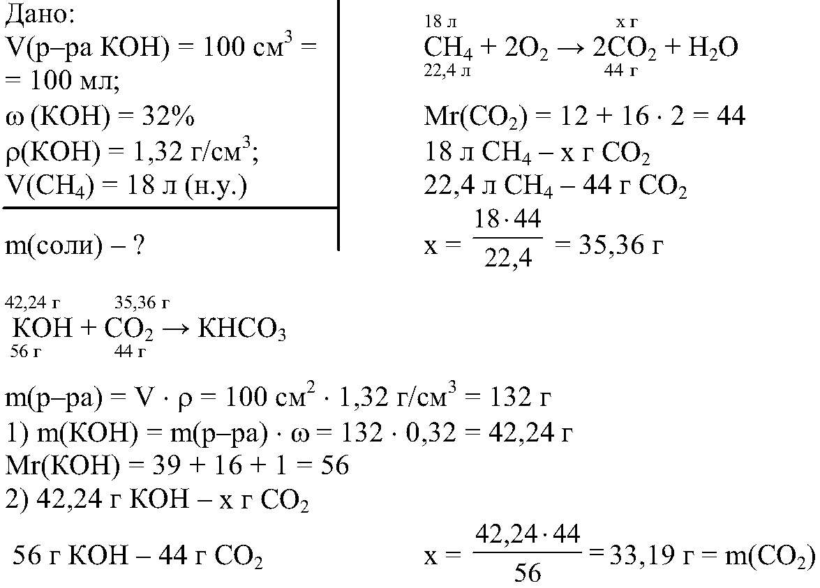 Какая соль и сколько ее получиться,если через 100 мл раствора,содержащего 0,32 массовых долей,или 32%,гидроксида калия (p=1,32 г /см в кубе),пропустили весь оксид углерода (IV),который образуется при сжигании 18 л метана (н.у)?