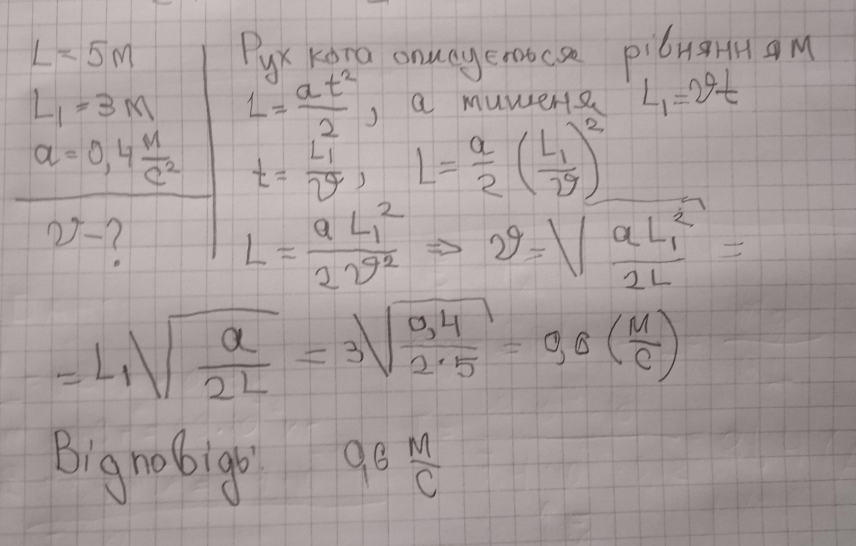 у момент, коли кіт помітив мишеня, воно перебувало на відстані 3м від нори і бігло до неї рівномірно. Кіт, наздоганяючи мишеня, почав рухатися з прискоренням 0,4 м/с^2. Вважайте, що кіт і мишеня рухалися по одній прямій, а відстань від кота до нори 5м. З якою найменшою швидкістю має рухатися мишеня, щоб встигнути прошмигнути в нірку?