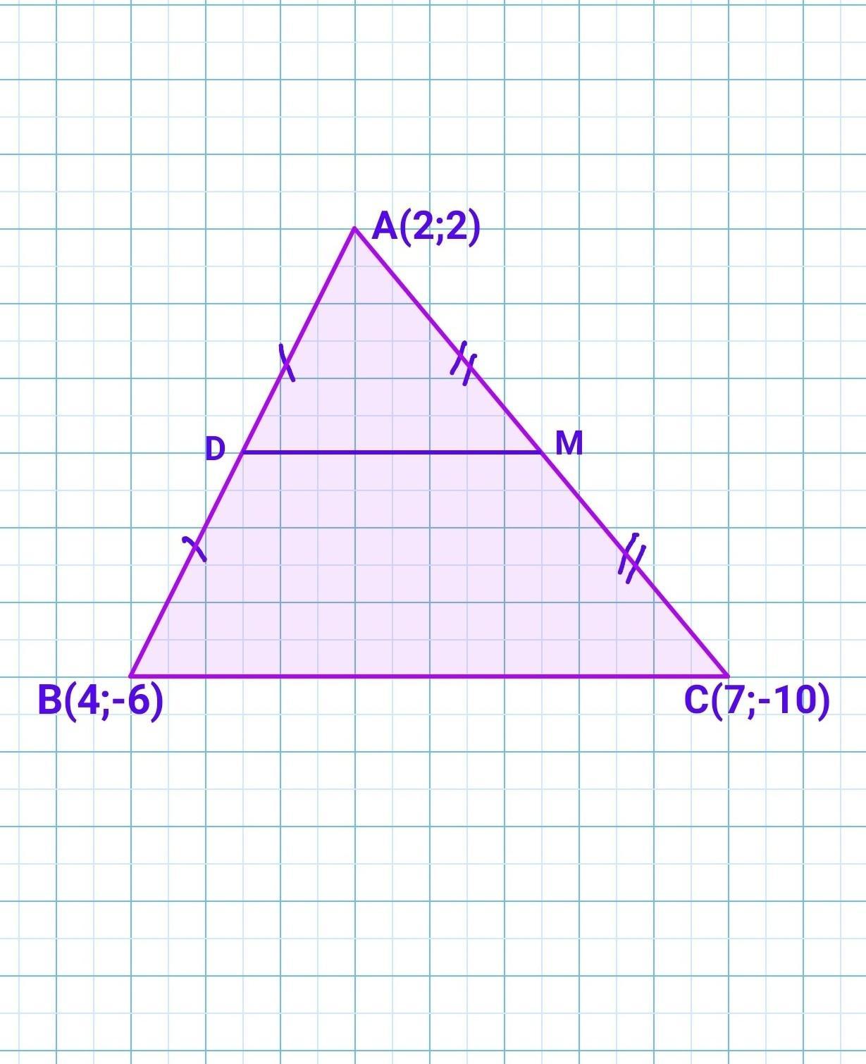 Треба знайти довжину середньої лінії DМ трикутника АВС (ДМ II ВС), якщо А(2;2), С(7;-10), В(4;-6).