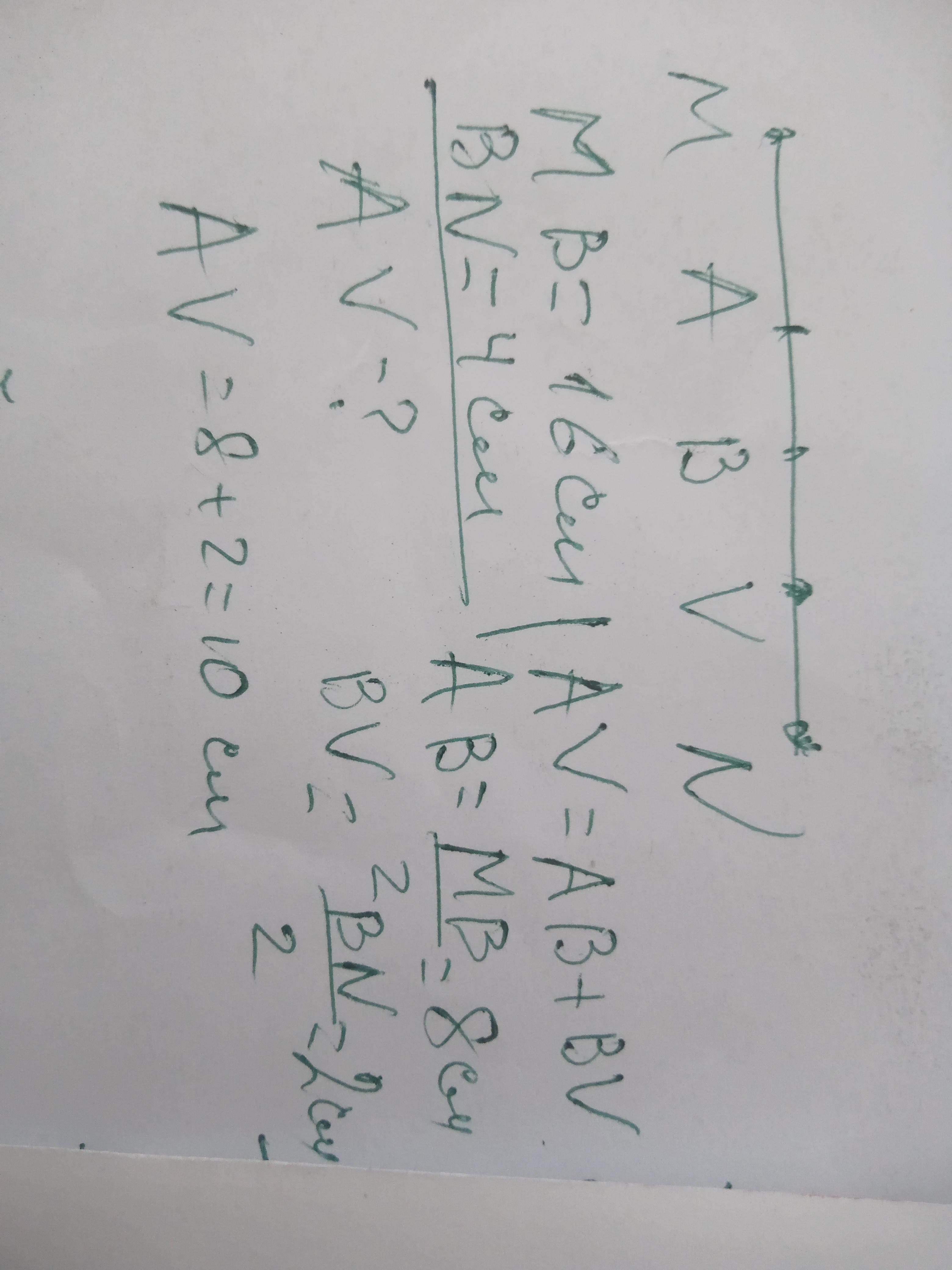 В належить вiдрiзку MN. Знайдіть довжину вiдрiзка AV, якщо A i V - середини вiдрiзкiв MB i BN, МВ = 16 см. BN = 4 см