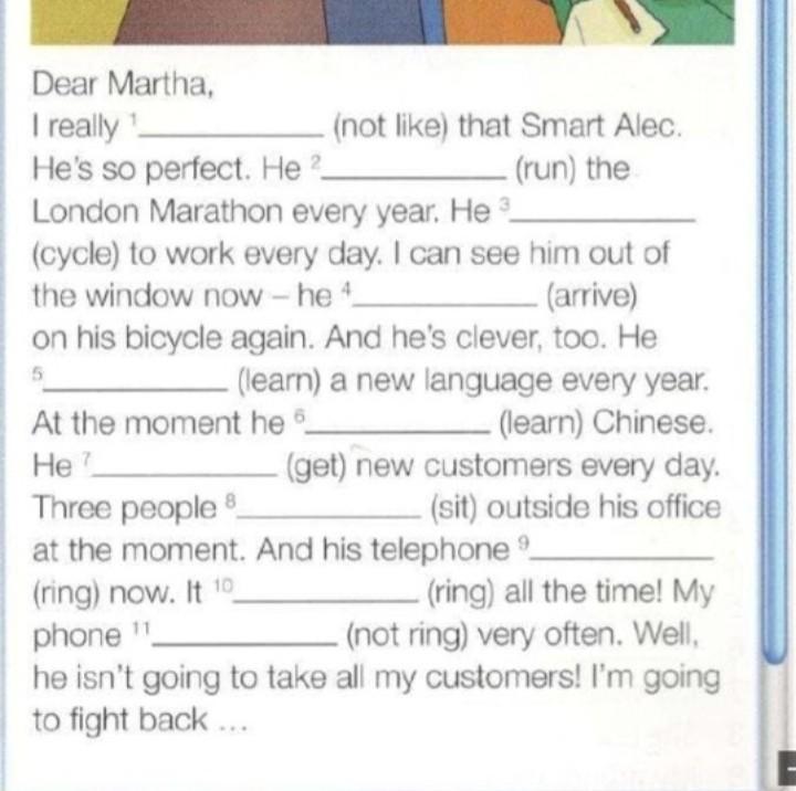 Dear Martha, I really ¹ He's so perfect. He 2_ .(not like) that Smart Alec. (run) the London Marathon every year. He 3 (cycle) to work every day. I can see him out of the window now- he 4_ (arrive) on his bicycle again. And he's clever, too. He (learn) a new language every year. 5 At the moment he (learn) Chinese. He (get) new customers every day. (sit) outside his office Three people at the moment. And his telephone º (ring) now. It 10 11 phone ¹¹ (ring) all the time! My (not ring) very often. Well, he isn't going to take all my customers! I'm going to fight back...