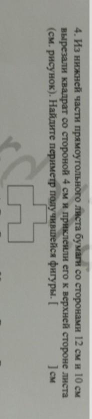 4. Из нижней части прямоугольного листа бумаги со сторонами 12 см и 10 см вырезали квадрат со стороной 4 см и приклеили его к верхней стороне листа (см. рисунок). Найдите периметр получившейся фигуры.
