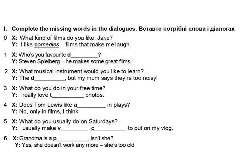 30 балов!! 1. Complete the missing words in the dialogues. 0 X: What kind of films do you like, Jake? Y: I like comedies - films that make me laugh. 1 X: Who's you favourite d Y: Steven Spielberg - he makes some great films. 2 X: What musical instrument would you like to learn? Y: The d but my mum says they're too noisy! 3 X: What do you do in your free time? Y: I really love t photos. 4 X: Does Tom Lewis like a_ Y: No, only in films, I think. in plays? 5 X: What do you usually do on Saturdays? Y: I usually make v_ to put on my vlog. с 6 X: Grandma is a p_ isn't she? Y: Yes, she doesn't work any more - she's too old