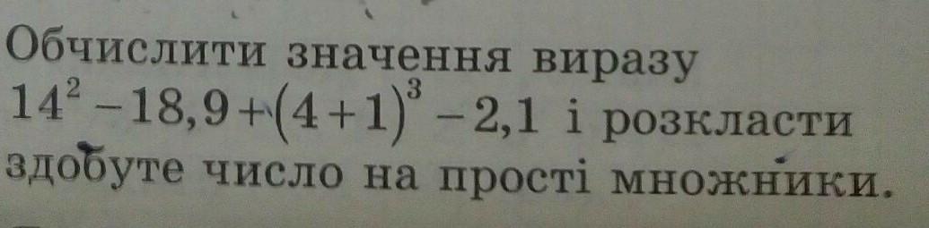 Обчислити значення виразу i 14²-18,9+(4+1)³ -2,1 і розкла здобуте число на прості множники