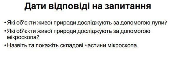 Дати відповіді на запитання • Які об'єкти живої природи досліджують за допомогою лупи? • Які об'єкти живої природи досліджують за допомогою мікроскопа? • Назвіть та покажіть складові частини мікроскопа.