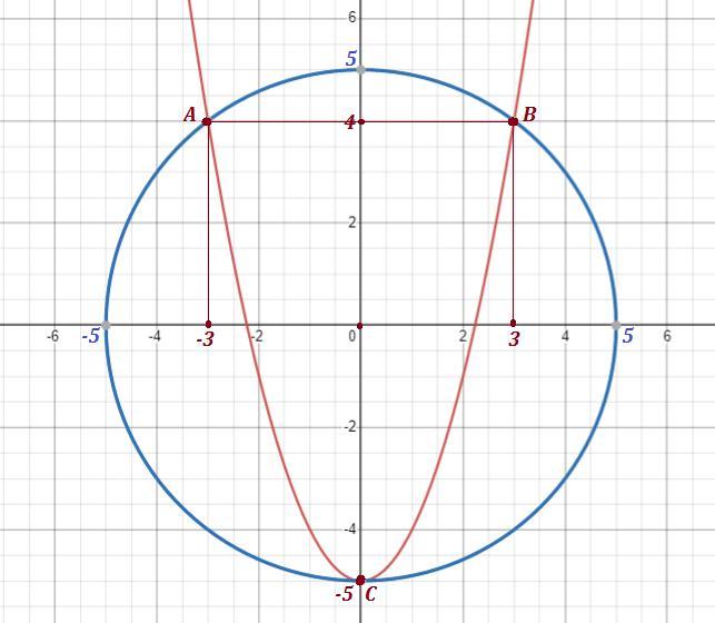 и радиусом R=5 пересекаются в точках А(-3;4) , В(3;4) , С(0;-5) .