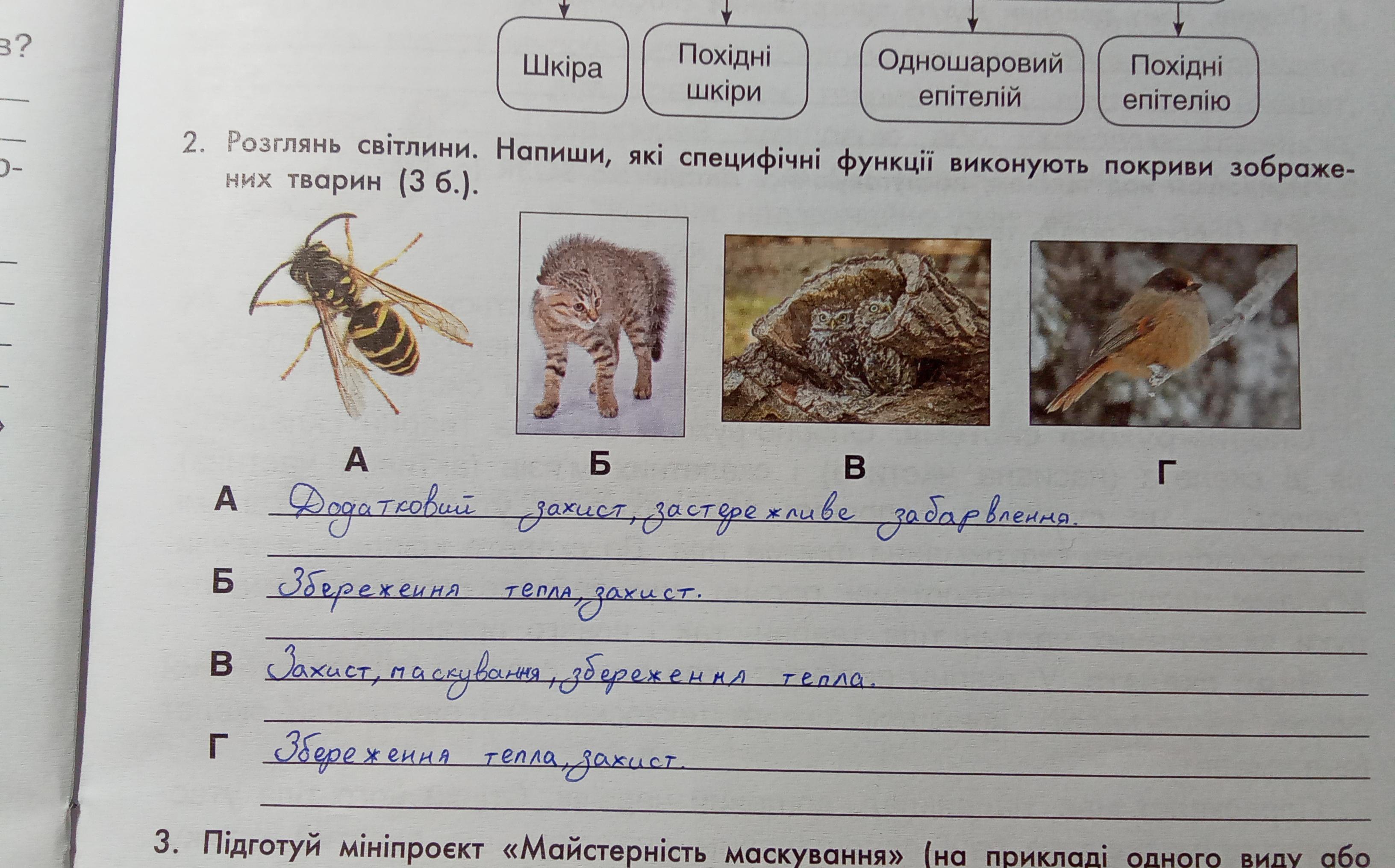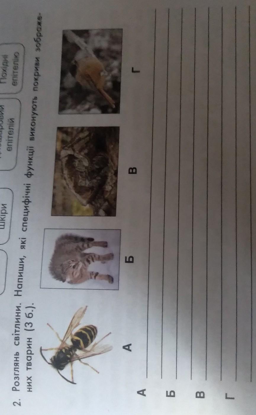 2. Розглянь світлини. Напиши, які специфічні функції виконують покриви зображе- них тварин (3 б.)