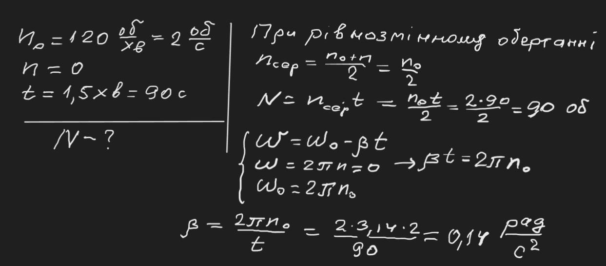 4. Тіло, що обертається з частотою 120 об/хв, зупиняється протягом 1,5 хв. Вважаючи рух рівносповільненим, визначити кількість обертів до по- вної зупинки. З яким кутовим прискоренням зупиняється тіло