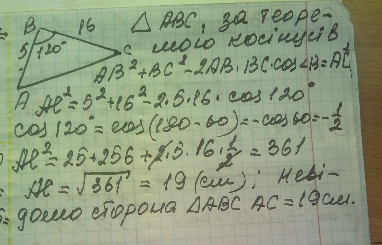 СРОЧНО!! ДАЮ 40 БАЛОВ Знайдіть невідому сторону трикутника якщо дві його сторони і кут між ними дорівнюють відповідно: 5 см, 16 см і 120 градусів (з малюнком)