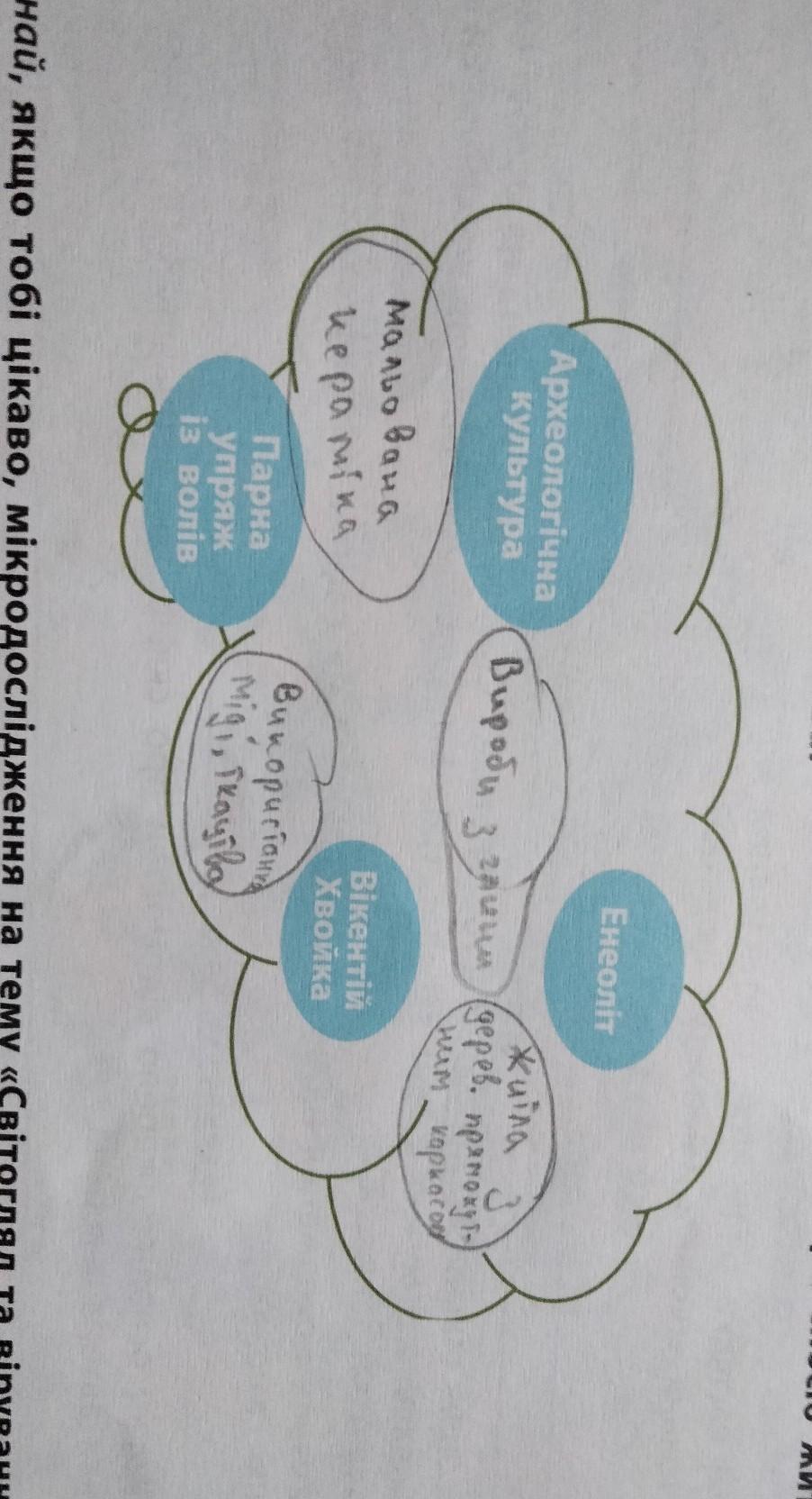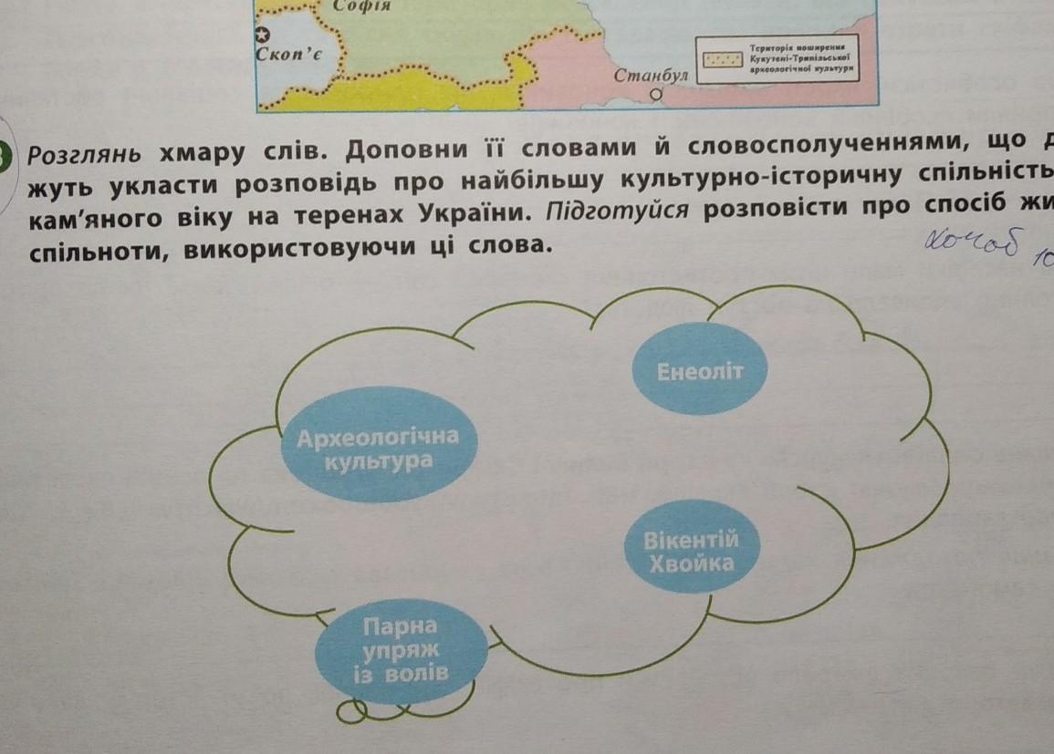 a 3 Розглянь хмару слів. Доповни її словами й словосполученнями, що допомо- жуть укласти розповідь про найбільшу культурно-історичну спільність мідно- 58. кам'яного віку на теренах України. Підготуйся розповісти про спосіб життя цієї спільноти, використовуючи ці слова. хочет Археологічна культура Парна упряж iз волів Енеоліт Вікентій Хвойка