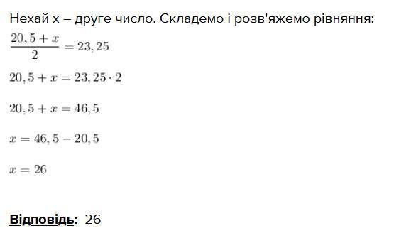 Середне арифметичне двох чисел дорівнює 23,25. Одне з них - 20,5. Знайди інше число.