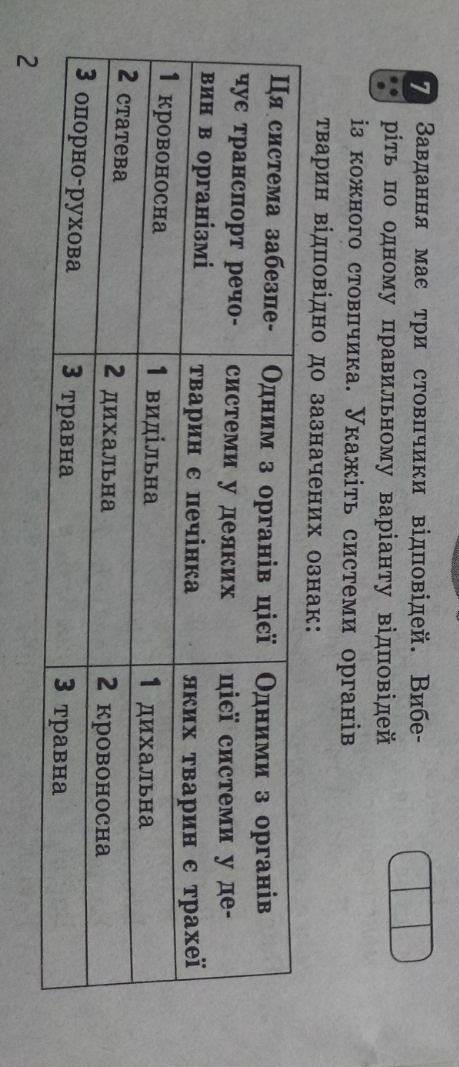 7 Завдання має три стовпчики відповідей. Вибе- ріть по одному правильному варіанту відповідей iз кожного стовпчика. Укажіть системи органів тварин відповідно до зазначених ознак: Ця система забезпе- Одним з органiвцiï чує транспорт речо- вин в організмі 1 кровоносна 2 статева 3 опорно-рухова 2 системи у деяких тварин є печінка 1 видiльна 2 дихальна 3 травна Одними з органів цієї системи у де- яких тварин є трахеї 1 дихальна 2 кровоносна 3 травна