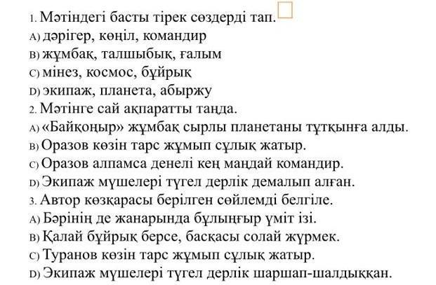 А) «Байконыр>> жұмбак сырлы планетаны тұтқынға алды. в) Оразов көзiн тарс жұмып сұлык жатыр. с) Оразов алпамса денелі кең мандай командир. D) Экипаж мүшелерi түгел дерлік демалып алган.