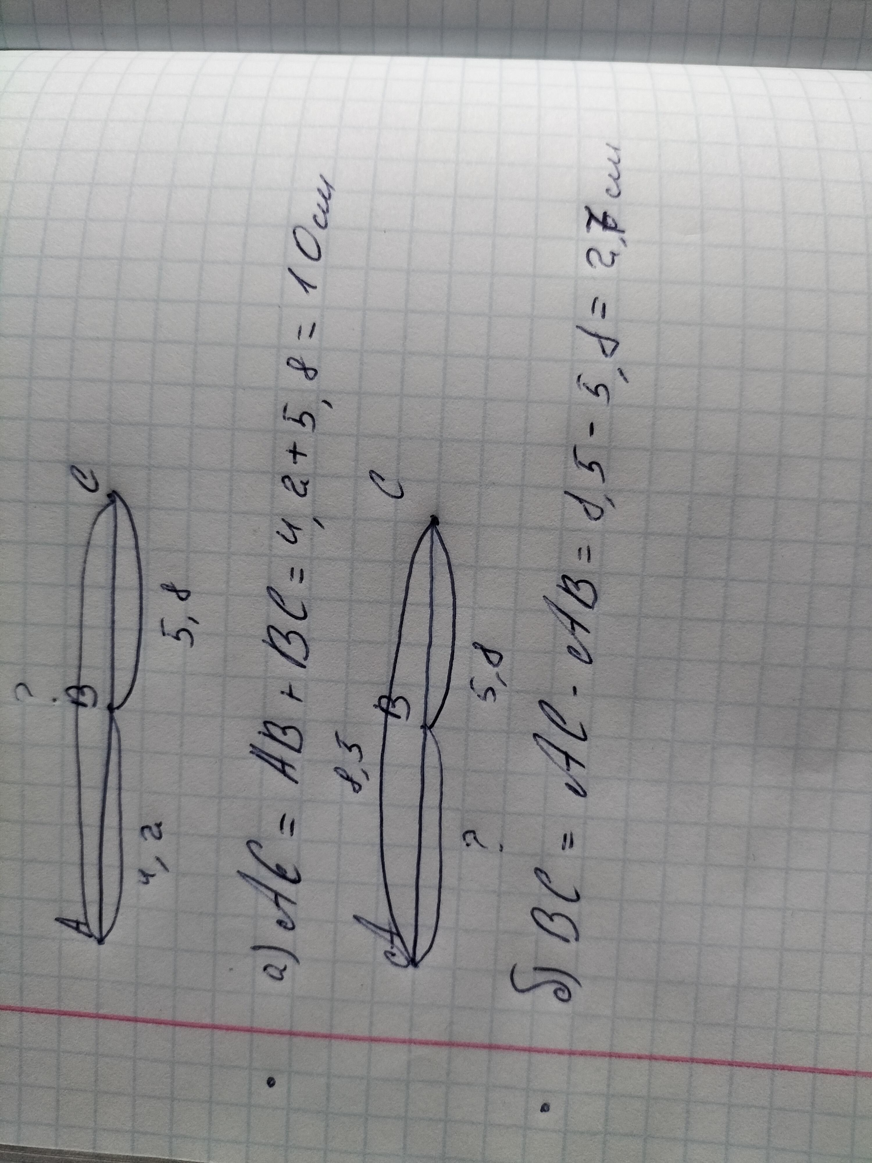 Точка В делит отрезок АС на два отрезка. Найдите: а) длину отрезка АС если AB = 4,2 см, ВС - 5,8 см; б) длину отрезка АВ, если АС - 8,5 см BC 5,8 см.