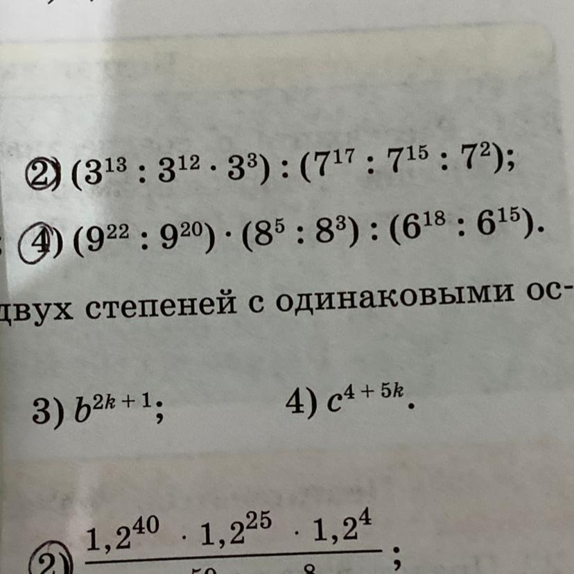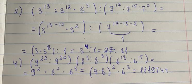 2) (3^13 : 3^12 × 3^3) : (7^17 : 7^15 : 7^2) = 3^4 : 1=3^4 ну или 81