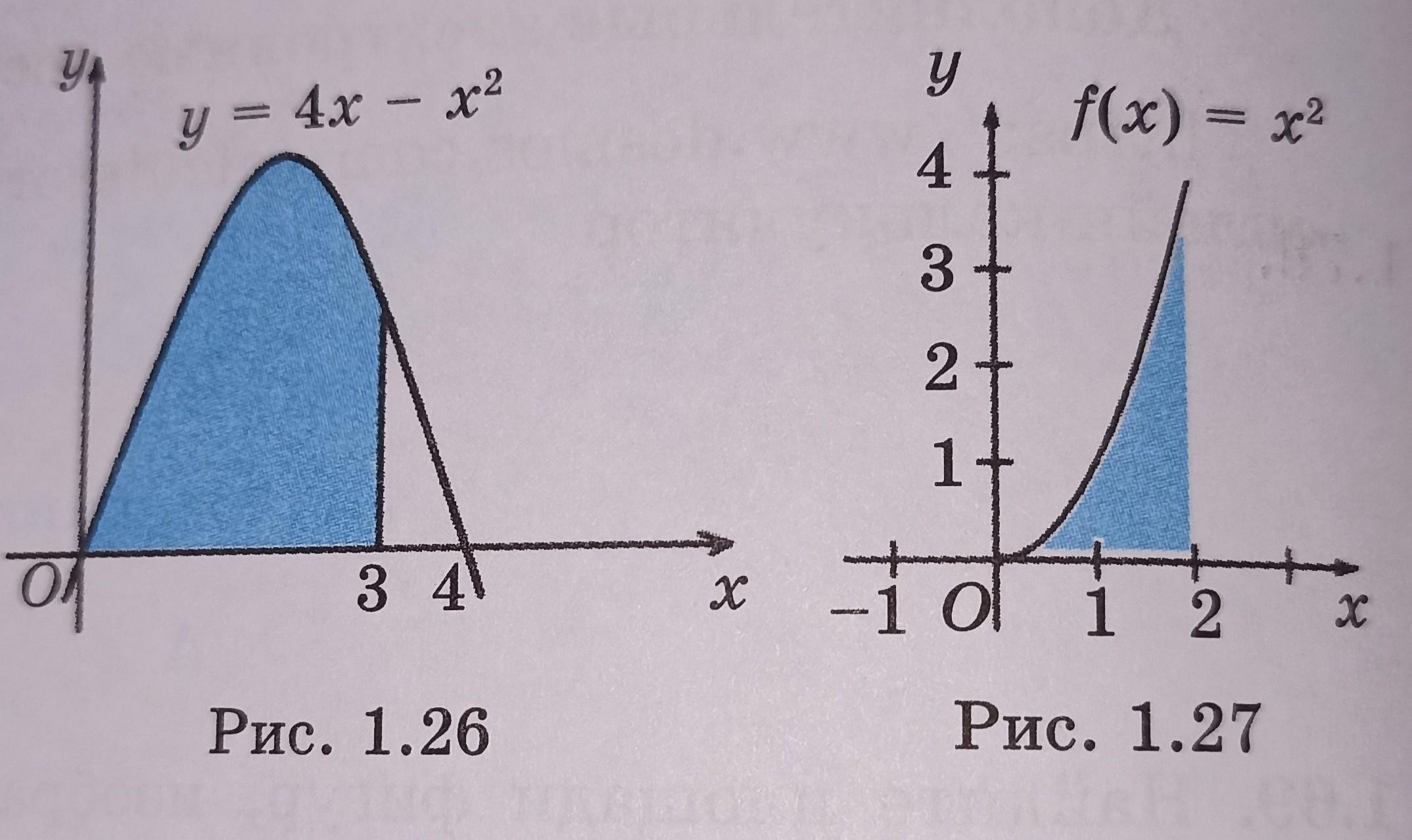 Вычислите площади криволинейных трапеций, изображённых на рисунках 1.26 – 1.27 записав их с помощью определенного интеграла.