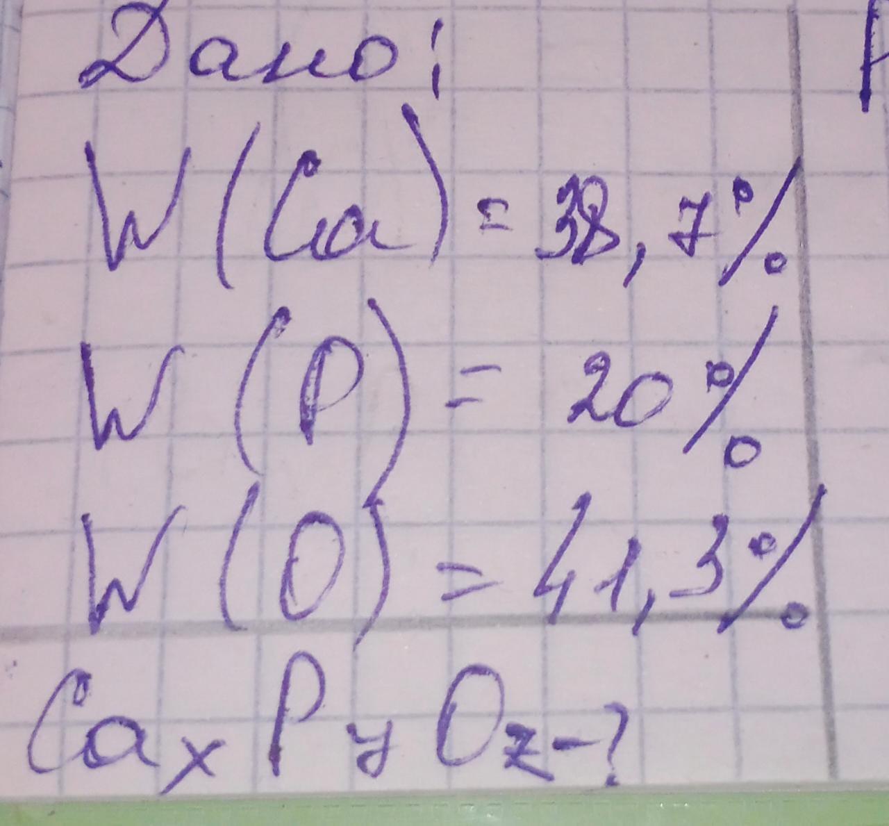 СРОЧНО НАДО ПОЖАЛУЙСТА!!!Дано! W (Ca) = 38, 7 %. W (P) = 20% W (0) = 41,3% Cax Py O₂